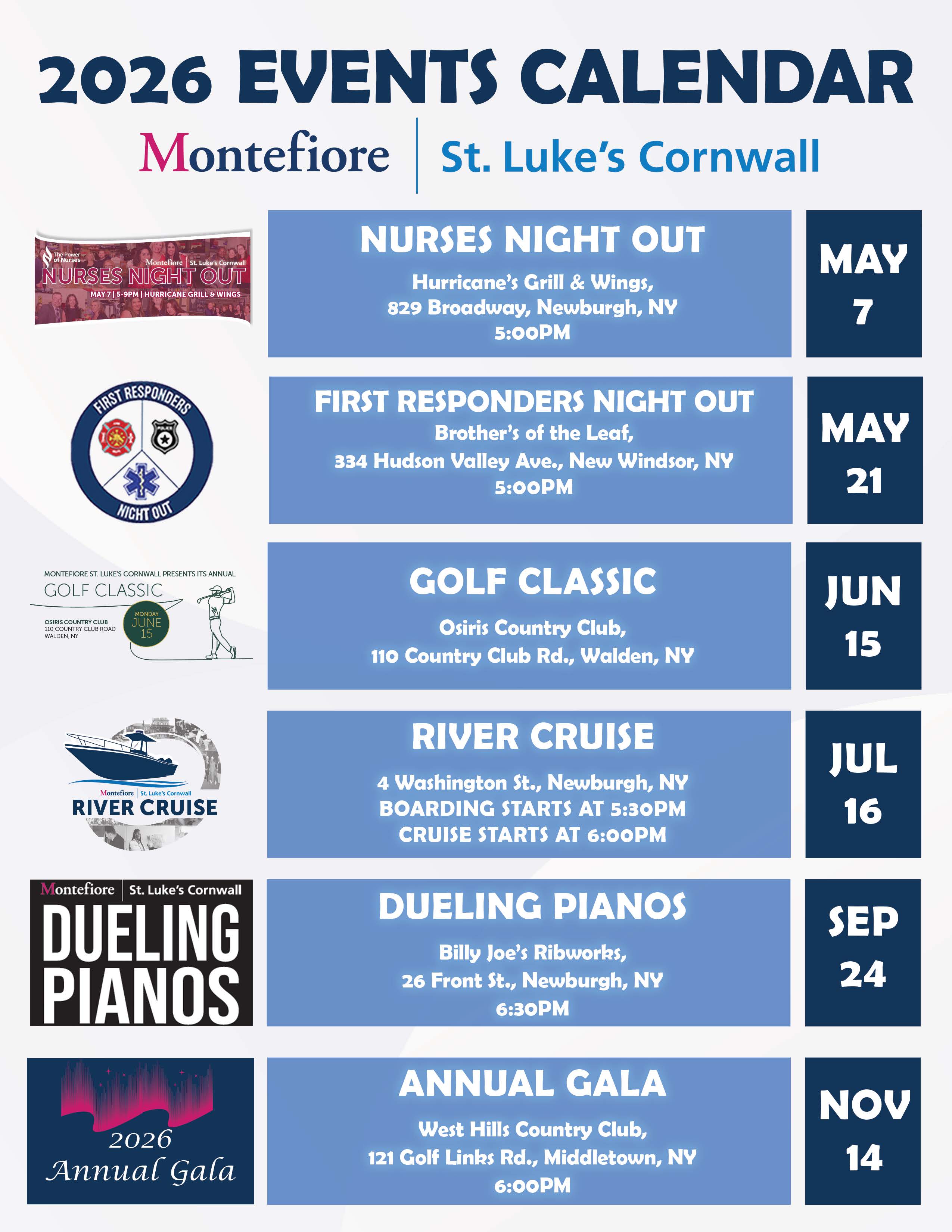 These events are open to community members, friends, and supporters, and all proceeds directly benefit Montefiore St. Luke’s Cornwall and its continued commitment to exceptional patient care.